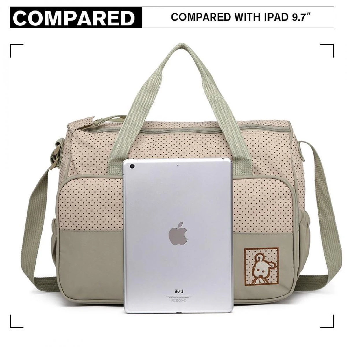 Te beginnen met de 2 formaten luiertassen: beiden hebben een groot hoofdcompartiment met dubbelle ritssluiting en met een extra binnenritsvak, handig voor grotere items. Tevens is er aan de voorkant een extra rits voor snelle toegang tot babydoekjes. Daarbovenop heb je ook 2 zijzakken voor flessen of uw paraplu! Naast dat de luiertas lekker veel opslagruimte biedt kun je deze ook nog eens op verschillende manieren dragen. Naast een schoudertas met verstelbare schouderriemen, heeft de tas ook handige handvaten. Hiermee is de tas snel op te pakken en kan deze zelfs dienen als tote-bag. Zo kies je telkens zelf hoe je de tas het liefste draagt.